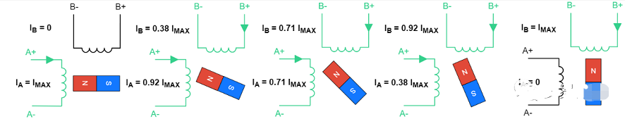 因為電流大小不同,將會導致線圈產生的磁場強度不同,從而導致轉子的平衡位置發(fā)生變化,這就是微步驅動的原理。