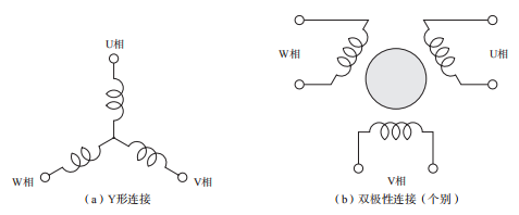 圖 3(a)所示的是三相繞組(U、V、W)采用 Y 形連接(星形連接)的方式。這種方式需要引出 3 個(gè)接線端子,需要采用 6 個(gè)晶體管的三相橋式電路驅(qū)動(dòng)。但是,這種方式只能進(jìn)行二相激勵(lì)。如果你想分別單獨(dú)控制各相的電流,則需要 如圖 3(b)所示從每相引出 2 個(gè)端子,且需要 3 組全橋電路來(lái)驅(qū)動(dòng)。