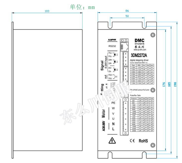 3DM2272A是基于DSP控制的高壓三相步進電機驅動器。它是將先進的DSP控制芯片和三相逆變驅動模塊結合一起所構成的新一代數字步進電機驅動器。驅動電壓為AC85V-220V,適配電流在7.2A以下、外徑86-130mm的各種型號的三相混合式步進電機。該驅動器內部采用類似伺服控制原理的電路,此電路可以使電機運行平穩,由于采用了平滑技術,低速時幾乎沒有震動和噪音,電機在高速時,仍保持較大的力矩。定位精度最高可達25600步/轉。