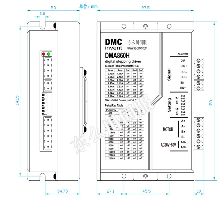 DMA860H產品是東么川公司采用先進的DSP控制芯片與獨特的控制電路結合一起所構成的新一代智能數字式細分型步進電機驅動器。基于精密的PID 電流控制算法設計,高速大力矩輸出。靜止時動態電流自動減半,使電機溫升大為降低,最大限度發揮電機的性能。用戶可以設置1~128 細分。低、 中、高速運行都非常平穩,幾乎沒有振動和噪音,完全解決了步進電機低速振動和噪音的缺陷。驅動器內部集成了參數自動調整功能 , 能夠針對不同參數電機自動生成最優的運行參數。